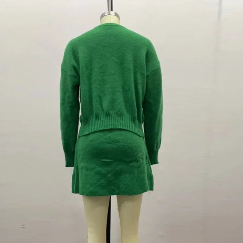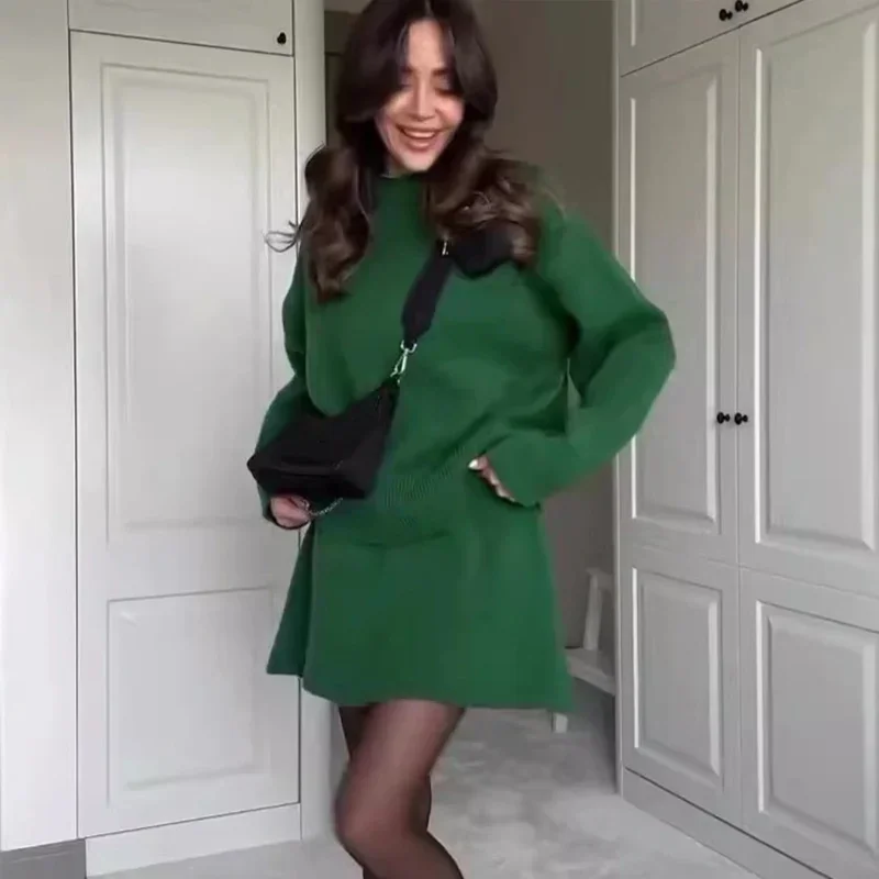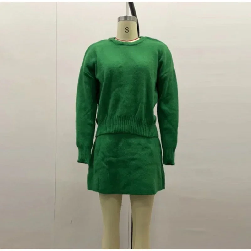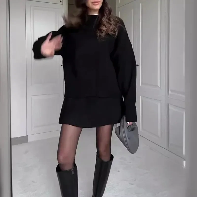 Featuring an elegant O-neck pullover and high-waist short skirt, this set exudes sophistication.